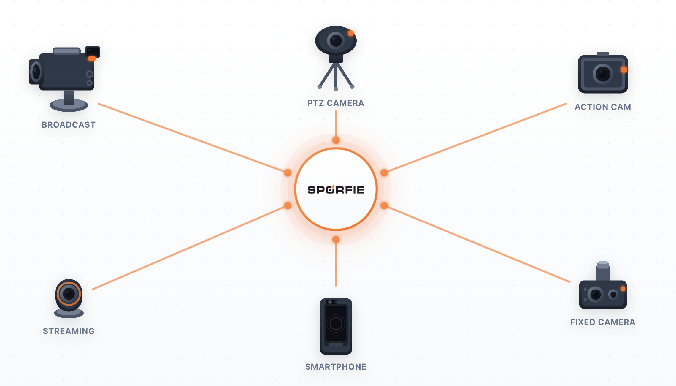 Oltre allo smartphone, puoi collegare camere esterne per una qualità ancora superiore. Sporfie supporta qualsiasi dispositivo con protocollo RTMP o SRT.