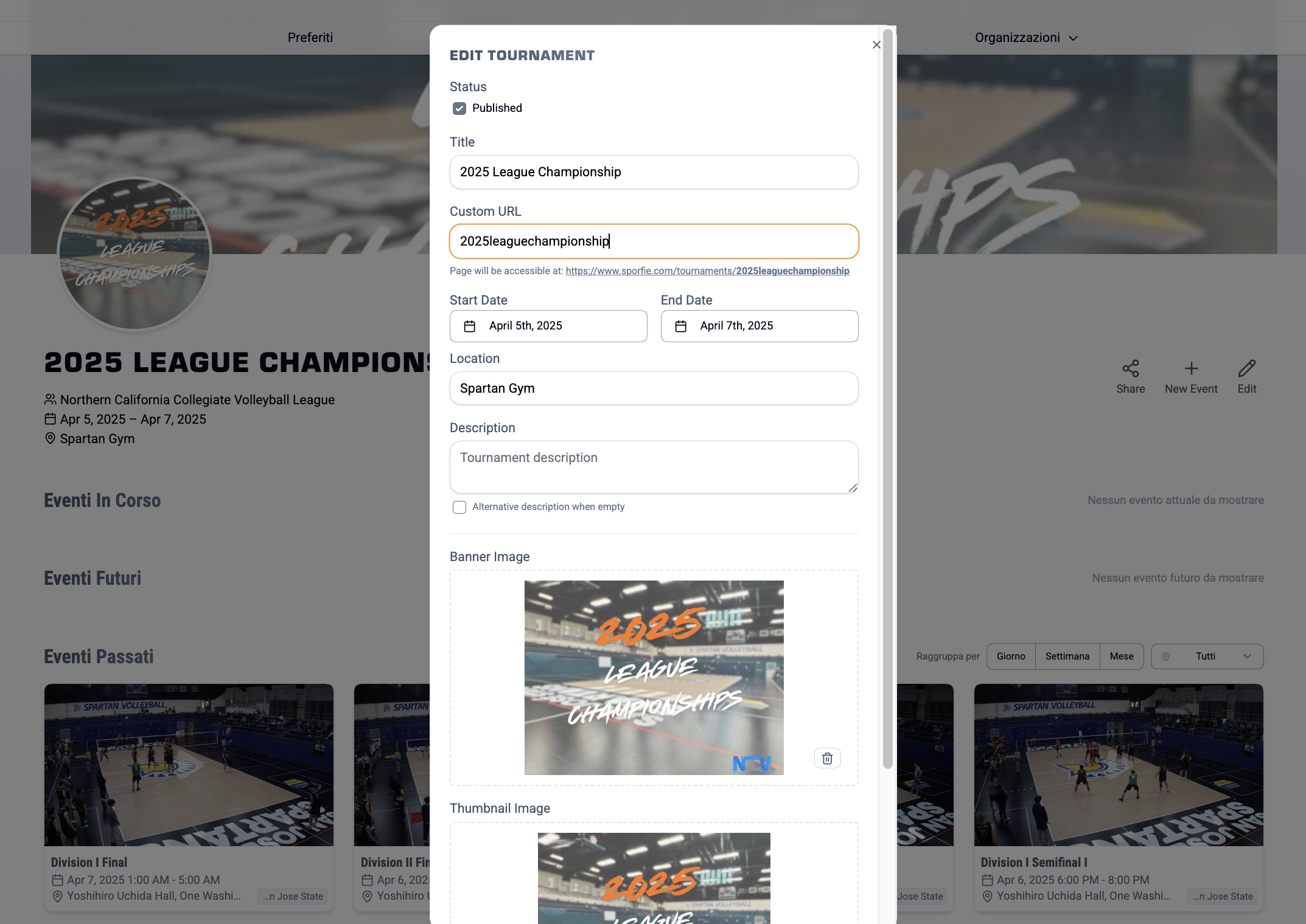 Gli organizzatori possono creare e gestire tornei direttamente dalla piattaforma. Collegare eventi, modificare informazioni, pubblicare o nascondere il torneo: tutto con pochi click.