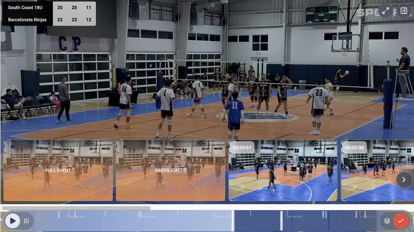 La timeline non mostra solo la durata del video: evidenzia i momenti importanti, i cambi di punteggio, le foto sincronizzate. Un colpo d'occhio per capire cosa è successo.